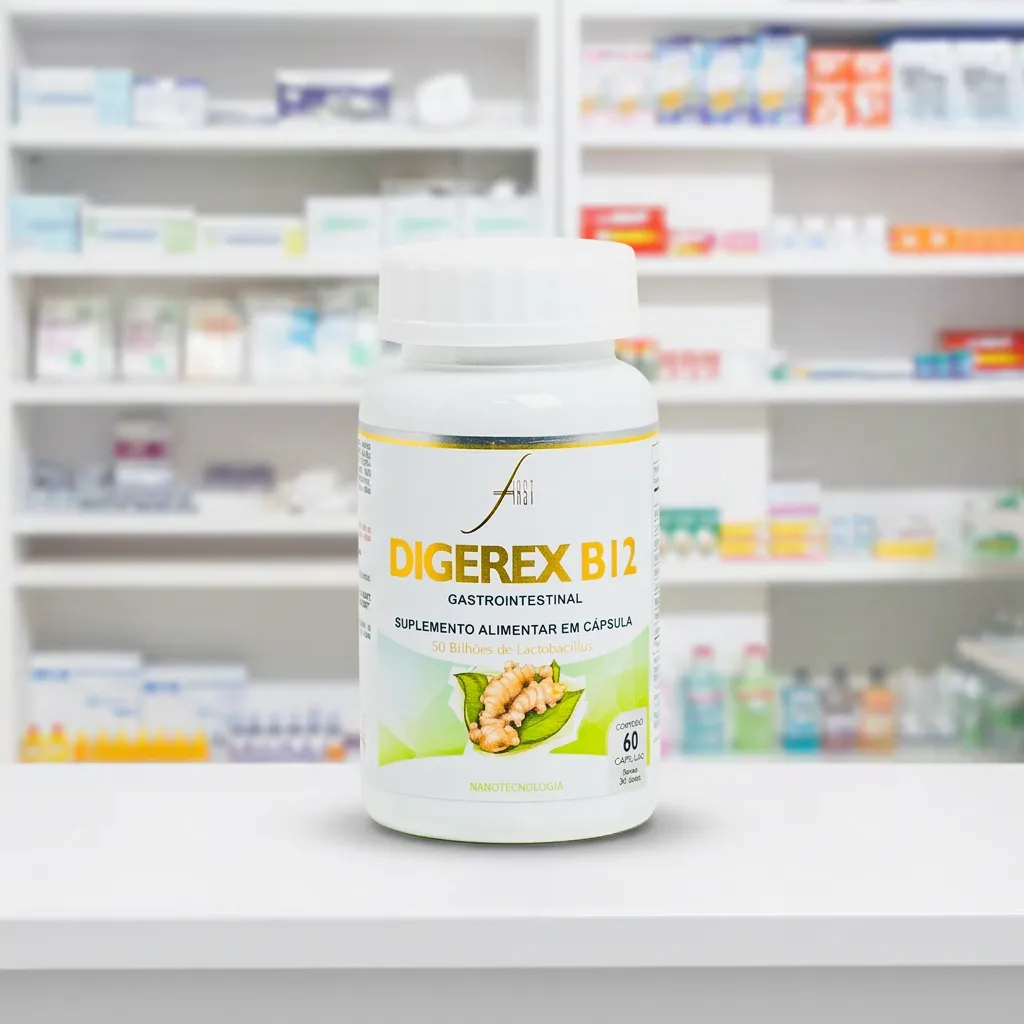 O Digerex B12 FIRST não é um medicamento. É um Suplemento Alimentar à base de Vitamina B6, Vitamina B12, Colina, Cromo e Inositol; produzido com nanotecnologia da Linha Nutricional First (Sistema Digestivo). Composição da Cápsula: Gelatina e Glicerina (umectante). Recomendação de USO: Ingerir 2 (duas) cápsulas ao dia, ou conforme orientação de um profissional de saúde. "CONSUMIR ESTE PRODUTO CONFORME A RECOMENDAÇÃO DE INGESTÃO DIÁRIA CONSTANTE NA EMBALAGEM". GESTANTES, NUTRIZES E CRIANÇAS ATÉ 3 (TRÊS) ANOS, SOMENTE CONSUMIR ESTE PRODUTO SOB ORIENTAÇÃO DE NUTRICIONISTA E/OU MÉDICO. * NÃO CONTÉM GLÚTEN